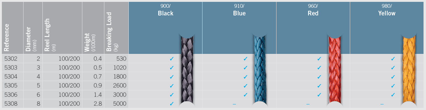 Diameter specific range of 12 strand Dyneema to ensure that the diameters work with any other hardware. The product is manufactured from Dyneema SK78 in a 12 strand formation with a fairly tight pitch to ensure that abrasion resistance is good while spliceablity is maintained.